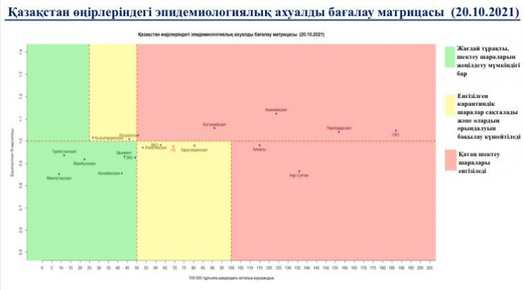 Матрица оценки эпидемиологической ситуации изменилась в регионах Казахстана 20 октября 2021 года, передает корреспондент Tengrinews.kz.