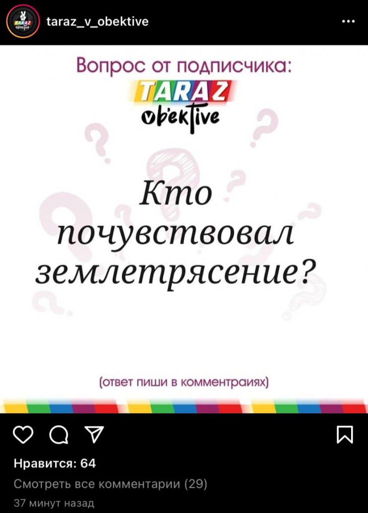 Пользователи группы "Тараз в объективе" в Instagram отмечают, что почувствовали небольшой толчок примерно в 17.17.