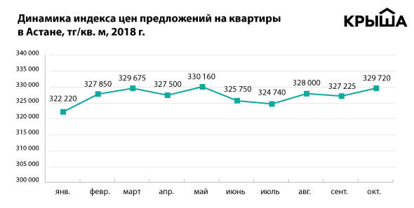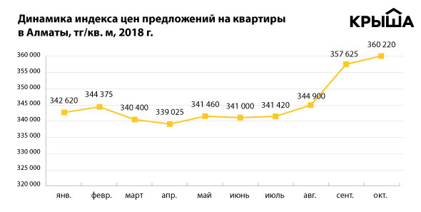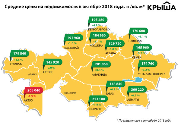 Наибольшее снижение индекса цен относительно первого месяца года зафиксировано в Таразе (-4 процента, или 6,1 тысячи тенге за квадратный метр), Актау (-4,6 процента, или 9,9 тысячи тенге за квадратный метр) и Актобе (-5,9 процента, или 9,1 тысячи тенге за квадратный метр).