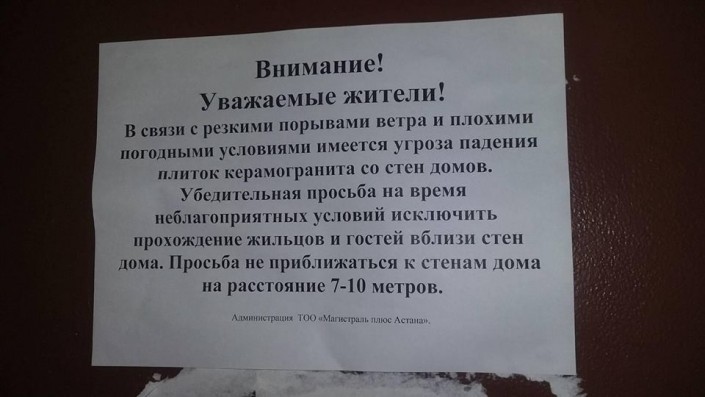 Автор публикации оставила к фото комментарий: "Суровый астанинский застройщик предупредил. Объявление на подъезде. Люди, где можно каску купить?". Данный пост начали активно комментировать другие пользователи Сети.