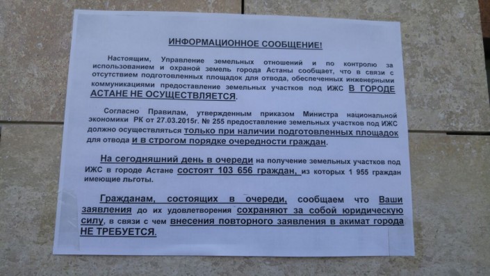 В объявлении, наклеенном у входа в акимат района, сообщается: "В очереди на получение земельных участков под ИЖС в Астане состоят 103 тысячи 656 граждан, из которых 1 955 человек имеют льготы".