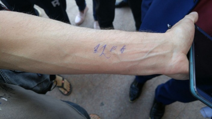 "Там молодой человек стоит, его люди выбрали. Он просто записывает людей и номер очереди, чтобы никто без очереди не влез", - объясняет женщина из толпы тем, кто только пришел.