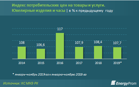 Серебряные ювелирные изделия подорожали на 2,7 процента за год, до 1,5 тысячи тенге по итогам ноября 2019-го. Дороже всего они стоят в Атырау (2,3 тысячи тенге, +11,4 процента за год), Нур-Султане (две тысячи тенге, -0,3 процента за год) и Алматы (1,9 тысячи тенге, + 3,1 процента за год).