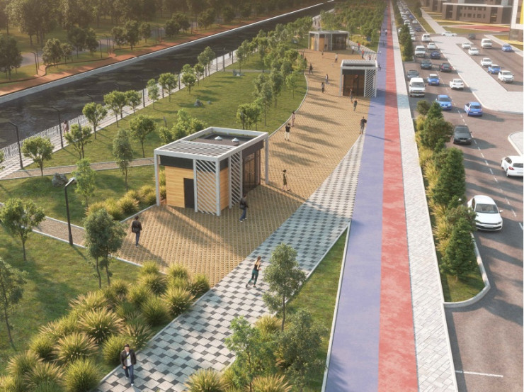 Предусмотрено создание безбарьерной среды для маломобильных групп с установкой павильонов быстрого питания и велосипедных станций.