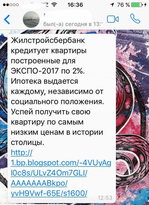 В "Жилстройсбербанке" опровергли сообщение о выдаче кредитов под 2 процента. Смс с текстом о том, что АО "Жилстройсбербанк Казахстана" выдает квартиры построенные в районе EXPO-2017 в Астане в кредит под 2 процента, активно распространялись в мессенджере WhatsApp, передает корреспондент Tengrinews.kz.