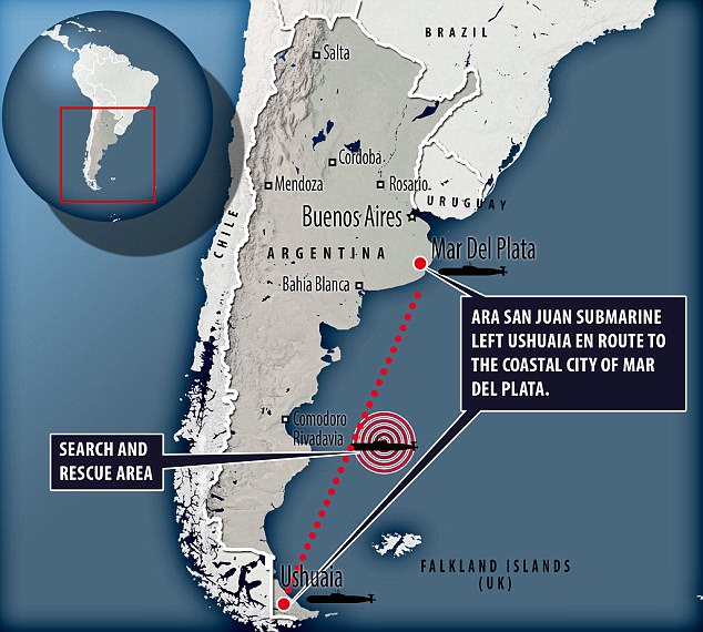 Субмарина совершала плановый маршрут из порта Ушуайя в город Мар-дель-Плата. В момент пропажи она находилась в 400 километрах от побережья Аргентины в Атлантическом океане. © dailymail