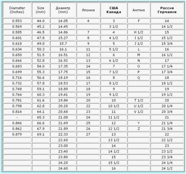 Международная таблица размеров колец