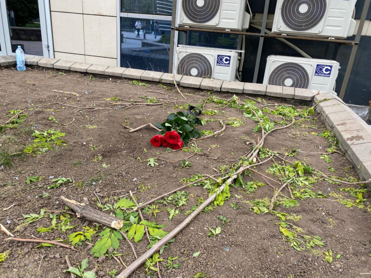 На место падения мужчины кто-то принес цветы.