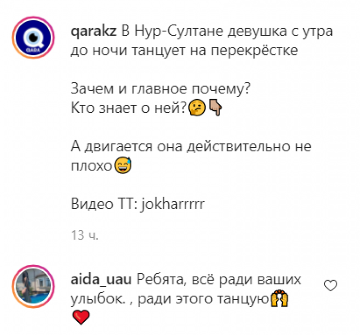 Девушка, которую, судя по всему, зовут Аида, пришла в комментарии и пояснила, что танцует "ради улыбок людей".