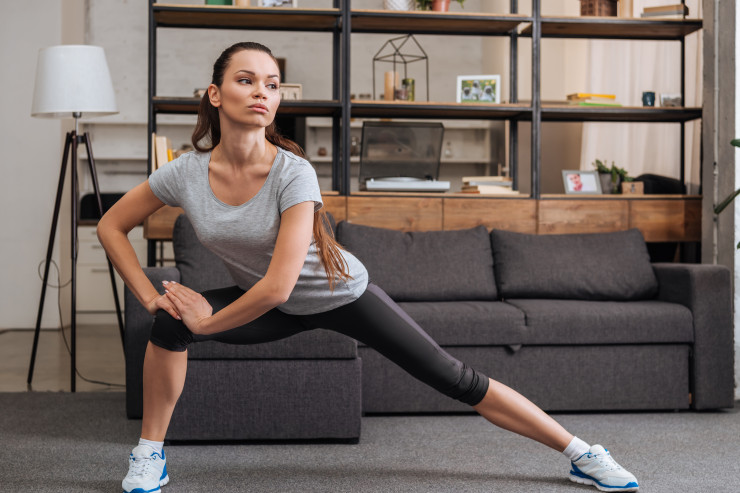 Выполнить фронтальные выпады. Упражнение поможет укрепить внутреннюю поверхность бедер. Для фронтального выпада в сторону нужно встать ровно и держать стопы на ширине плеч. Теперь делаем шаг в сторону и приседаем. Вес тела не переносим полностью на одну сторону, а равномерно распределяем между обеими ногами.