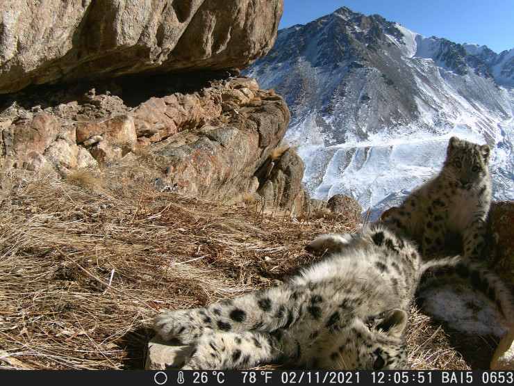Резвящиеся снежные барсы попали на камеру в горах