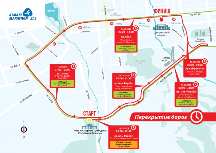 Старт полумарафону будет дан в Парке Первого Президента. Движение на участке дороги по северной стороне проспекта Аль-Фараби от Мустафина до Навои будет перекрыто с 00.00 до 12.30 часов. Южная (верхняя) сторона Аль-Фараби от улицы Мустафина до улицы Навои будет перекрыта с 07.20 до 08.00 часов.