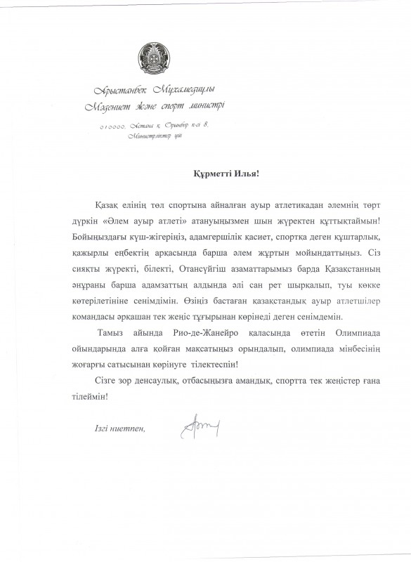 "Этот вид спорта (тяжелая атлетика - Прим. автора) для Казахстана стал уже родным. Вы своей силой и волей, гуманностью, увлеченностью спортом и трудолюбием добились признания народов всего мира. Когда у нас есть такие люди, как вы, гимн Казахстана будет звучать еще много раз, и наш флаг будет подниматься много раз. Я уверен, что сборная Казахстана по тяжелой атлетике во главе с вами всегда будет на вершине пьедестала", - отметил в письме Арыстанбек Мухамедиулы.