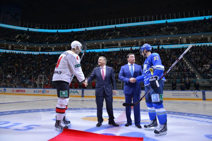 Символическое вбрасывание на льду новой арены произвели президент Казахстанской федерации хоккея с шайбой Аскар Мамин и президент Международной федерации хоккея и член Международного олимпийского комитета Рене Фазель.