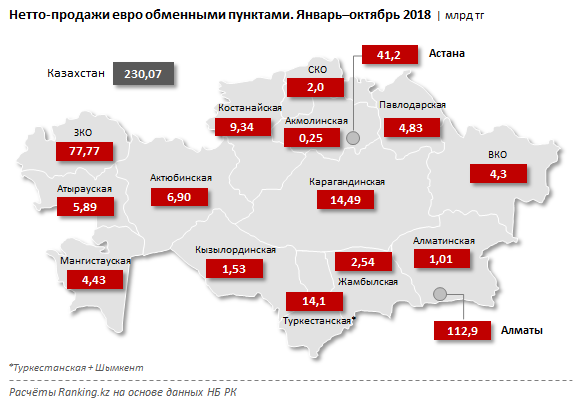 В целом с начала 2018 года объем нетто-продаж евро обменными пунктами составил 230,1 миллиарда тенге. Лидируют здесь также Алматы и Астана - 112,9 миллиарда тенге и 41,2 миллиарда тенге соответственно. Примечательно, что замыкает тройку лидеров уже Карагандинская область (14,5 миллиарда тенге), незначительно опережая Туркестанскую область и Шымкент (14,1 миллиарда тенге).