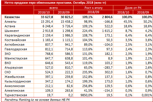 Среди регионов страны по объему нетто-продаж евро лидируют мегаполисы. На первом месте Алматы с объемом 15,3 миллиарда тенге, что на 1,1 процента меньше, чем в октябре. Доля от РК сократилась с 50,2 процента до 45,5 процента.