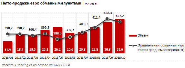 Объем нетто-продаж ("чистые" продажи валюты, то есть продажа минус покупка) евро обменными пунктами в октябре достиг 33,6 миллиарда тенге, что на 9,1 процента больше, чем в прошлом месяце. Это самый высокий показатель в текущем году.