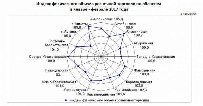 Таким образом, по данным ведомства, розничная торговля выросла везде, кроме Астаны и ЗКО, в которой индекс физического объема розничной торговли составил 99,6 процента. Наибольший рост зафиксирован в Алматы, где ИФО составил 109 и в Северо-Казахстанской области, с аналогичной цифрой. При этом наибольший удельный вес в общем объеме розничной торговли республики в январе - феврале 2017 года приходится на Алматы (32 процента), Астану (10,7), Карагандинскую (9,3) и Восточно-Казахстанскую (8,3 ) области.