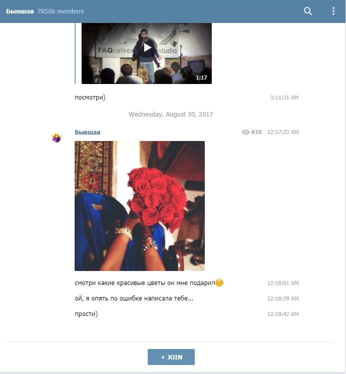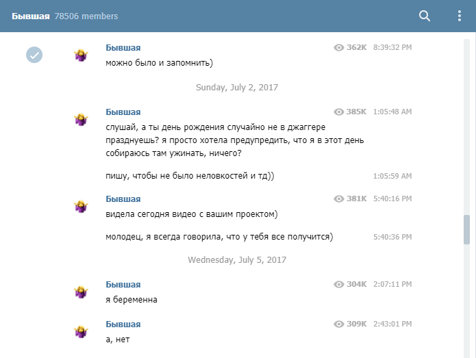 Telegram-канал "Бывшая" с выдуманными сообщениями от бывшей девушки был создан в июне 2017 года и быстро набрал вирусную популярность: за первые две недели на него подписались 35 тысяч человек. Сейчас число подписчиков превышает 75 тысяч.