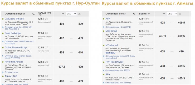 В обменных пунктах Нур-Султана доллары продают по 408,7 - 409,2 тенге, покупают по 407 - 408,2 тенге. В Алматы продажа установилась на уровне 409,5 - 410,3 тенге, покупка - 407,9 - 408,8 тенге.