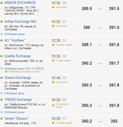 По данным портала, американская валюта стоит в обменных пунктах в пределах от 390,7 до 391,8 тенге.