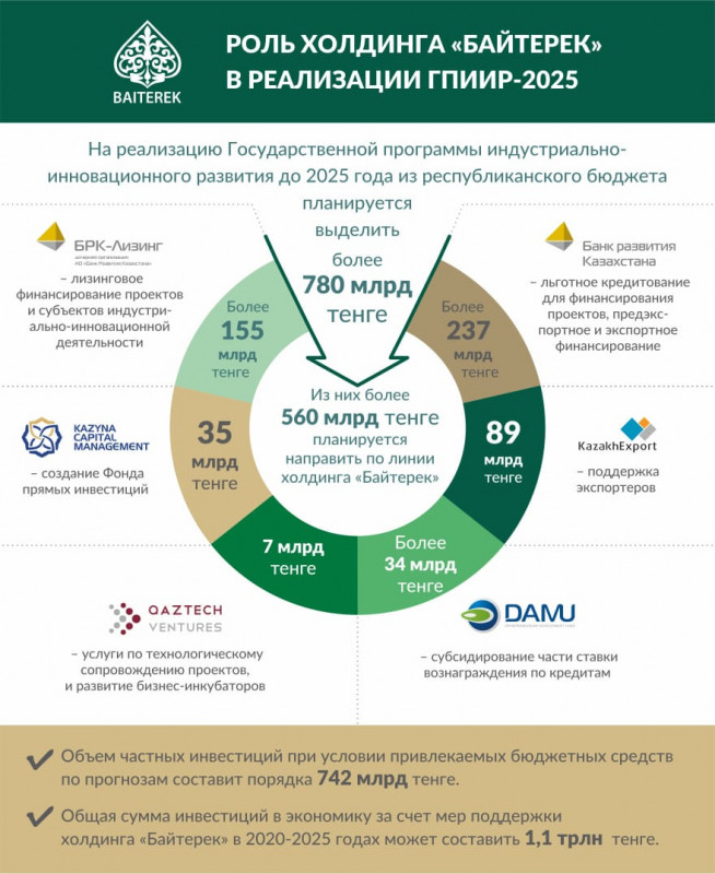 - В целом планируется, что расходы на программу составят около 780 миллиардов тенге, из них расходы для АО "НУХ "Байтерек" планируется порядка 560 миллиардов 723 миллиона тенге. Следует отметить, что из 560,7 миллиарда тенге возвратные бюджету почти 393 миллиарда тенге. Всего вливание в экономику обрабатывающей промышленности за счет мер поддержки холдинга в 2020-2025 годах по программе ГПИИР, по прогнозам, составят 1,1 триллиона тенге.