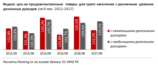 В целом за январь-сентябрь цены на продовольствие для наименее обеспеченных казахстанцев выросли всего на 2,2 процента, в то время как продуктовая корзина (включая напитки и табачные изделия) наиболее обеспеченных стала стоить дороже сразу на 5,1 процента.