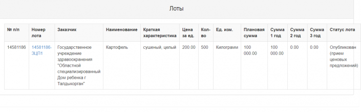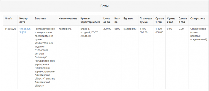 Согласно объявлению ГКП на ПВХ "Областная детская больница" государственного учреждения "Управление здравоохранения Алматинской области" акимата Алматинской области, организация приобретает 5 500 килограммов картофеля по цене в районе 227 тенге. Аналогичную стоимость на покупку 500 килограммов этого овоща установило ГУ здравоохранения "Областной специализированный Дом ребенка города Талдыкорган". Отметим, на портале государственных закупок цена указана без налога на добавочную стоимость.
