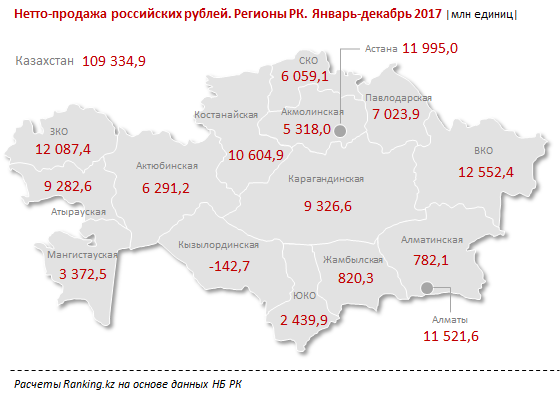 Самые высокие положительные нетто-продажи обменных пунктов российских рублей - в приграничных ВКО и ЗКО - 12,6 миллиарда рублей (+25 процентов) и 12,1 миллиарда рублей (+20,1 процента) соответственно. Замыкает тройку лидеров Алматы - 12 миллиарда RUB, рост за год на 9 процентов.