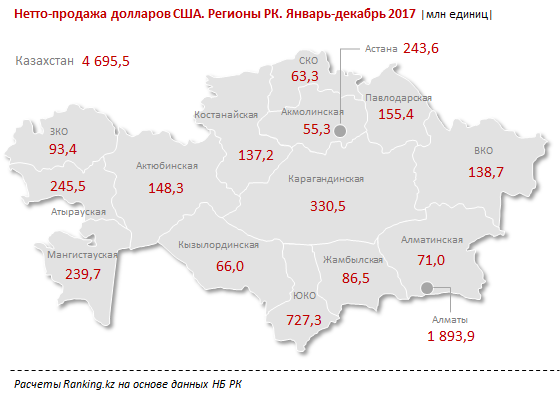 За 2017 год положительные нетто-продажи долларов были во всех регионах РК, годом ранее в трех регионах РК жители сдали в обменники больше, чем купили.
