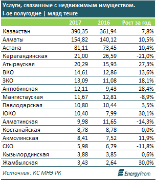 Только за месяц было заключено 19,5 тысячи сделок купли-продажи недвижимости, что на 26 процентов больше, чем год назад. Всего за первое полугодие объем услуг, связанных с недвижимым имуществом, достиг 390,35 миллиарда тенге. Это на 7,8 процента больше, чем в аналогичном периоде прошлого года.