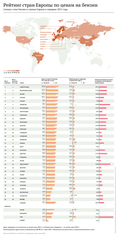 Цены на бензин среди 33 стран Европы оказались самыми высокими в Нидерландах - 103,9 рубля (340,9 тенге). В первой пятерке также находятся Великобритания и Дания. Последние места с самым дешевым бензином в рейтинге традиционно занимают страны Таможенного союза. На 32-м месте - Казахстан, где литр 95-го бензина в начале июля 2015 года стоил 39,2 рубля (128,6 тенге) за литр. На последнем месте рейтинга - Россия - 35,7 рубля (117,1 тенге).