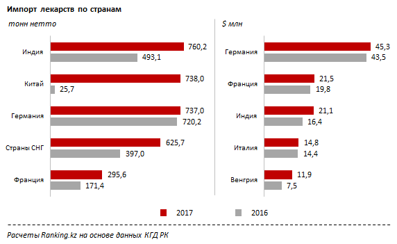 В текущем году больше половины всех лекарств было привезено из Индии - 760,2 тонны (21,1 миллиона долларов), Китая - 738 тонн (0,8 миллиона долларов), Германии - 737 тонн (45,3 миллиона долларов) и стран СНГ - 626 тонн (7,9 миллиона долларов). Отметим, что за четыре месяца физический объем импорта китайских препаратов вырос в 30 раз, индийских - увеличился на 54 процента, тем самым сместив немецкие препараты на третье место в структуре ввоза.