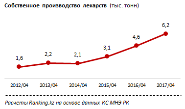 Примечательно, что собственное производство лекарственных препаратов ежегодно растет в среднем на 32 процента. За четыре месяца производство выросло еще на 36 процентов к аналогичному периоду прошлого года, составив 6,2 тысячи тонн.