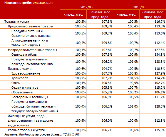 В годовом разрезе в группе товаров заметнее всего подорожали алкогольные напитки и табачные изделия (+9,8 процента), среди услуг - здравоохранение и транспорт (+7,7 процента). В сравнении с апрелем наибольший рост цен отмечен в сегменте ЖКХ - жилищные услуги, вода, электроэнергия, газ и другие виды топлива подорожали на 0,9 процента за месяц.