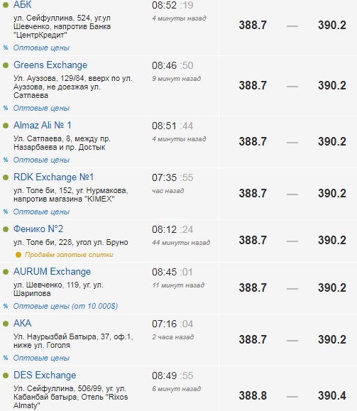 По данным портала, иностранную валюту продают в обменных пунктах за 389-390,4 тенге.
