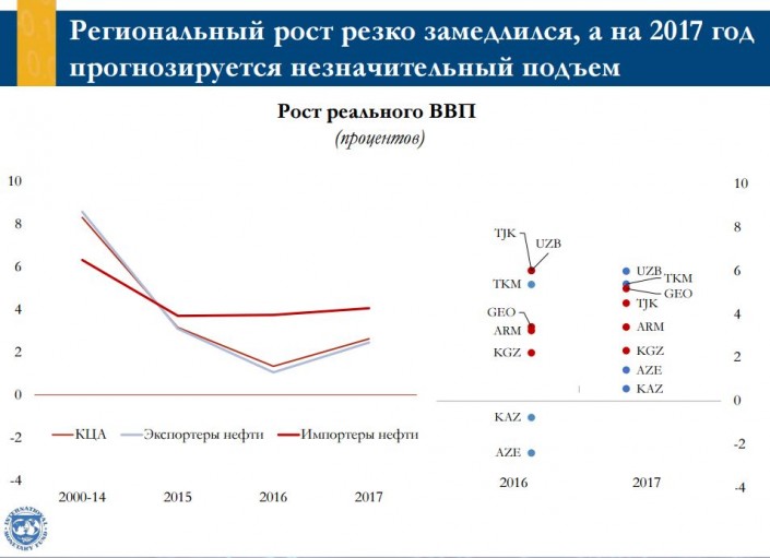 "В ближайшие годы уровень цен на биржевые товары и темпы роста в странах, являющихся основными торговыми партнерами, будут оставаться низкими. Прогнозируется медленный и непрочный подъем экономики в условиях вялой внешнеэкономической конъюнктуры, обострения факторов уязвимости и снижения пространства для маневра в сфере экономической политики", - сказал заместитель директора департамента стран Ближнего Востока и Центральной Азии МВФ Юха Кяхконен.
