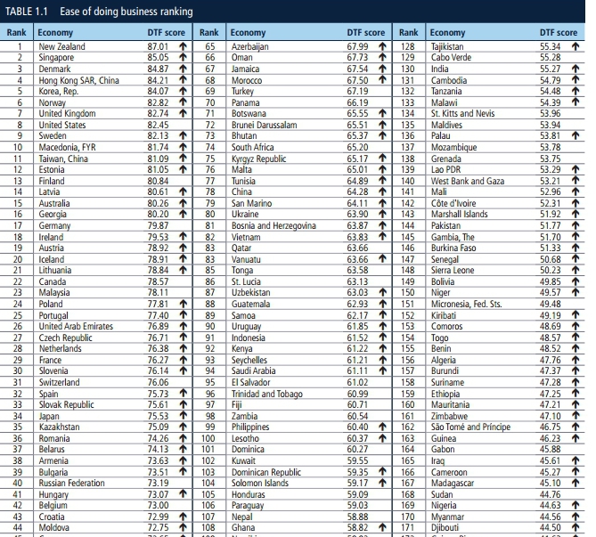 Всего в списке представлено 190 стран, включая Сомали. Возглавила рейтинг Новая Зеландия, лидер прошлых десяти лет - Сингапур - спустился на вторую строчку. Третье место заняла Дания. В десятке оказались Гонконг, Южная Корея, Великобритания, Норвегия, США, Швеция и Македония.
