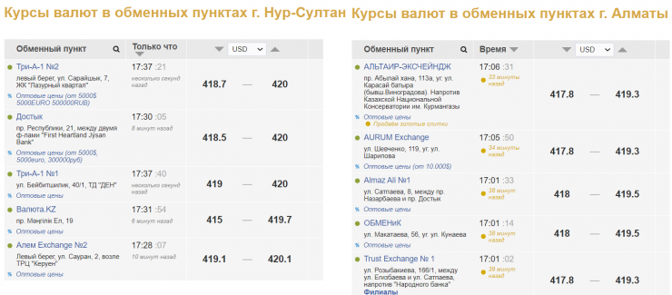 Сейчас обменники Нур-Султана продают доллар по 419,7-420,1 тенге, покупают - по 415-419,1 тенге. В обменных пунктах Алматы продажа сложилась на уровне 419,3-419,5 тенге за доллар, покупка - 417,8-418 тенге.