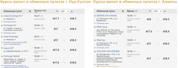 По данным kurs.kz, в настоящее время в обменных пунктах Нур-Султана продажа доллара сложилась на уровне 418,5-418,7 тенге, покупка - 417-417,7 тенге. В обменниках Алматы доллар продают по 418,5-419,5 тенге, покупают по 417-418 тенге.