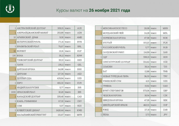 В пятницу курс доллара будет равен 429,84 тенге. Отметим, что официальный курс американской валюты на 25 ноября составляет 429,73 тенге.