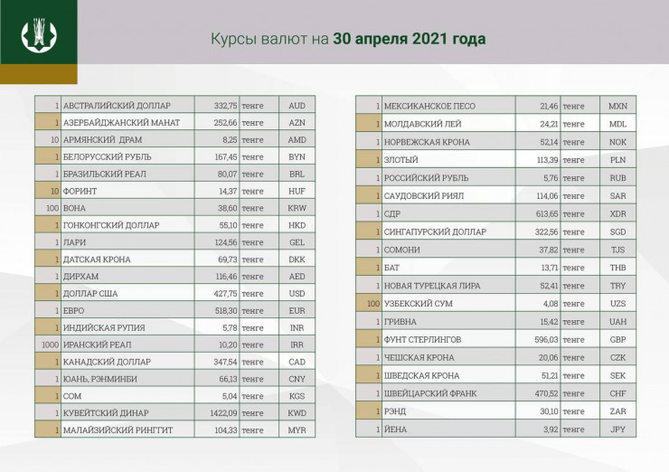 Национальный банк Казахстана установил официальный курс доллара на 30 апреля, передает Tengrinews.kz.