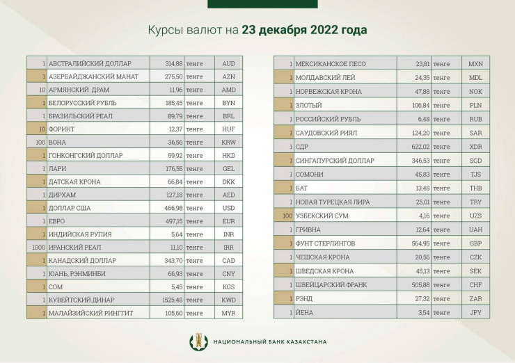 Национальный банк Казахстана установил официальные курсы доллара и рубля к тенге на 23 декабря, передает корреспондент Tengrinews.kz.