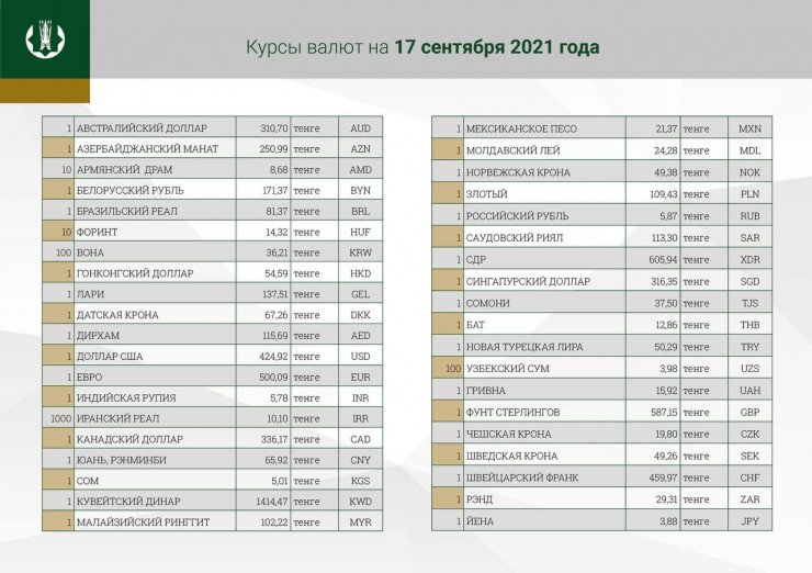 В пятницу курс доллара будет равен 424,92 тенге. Отметим, что официальный курс американской валюты на 16 сентября составляет 426,39 тенге.