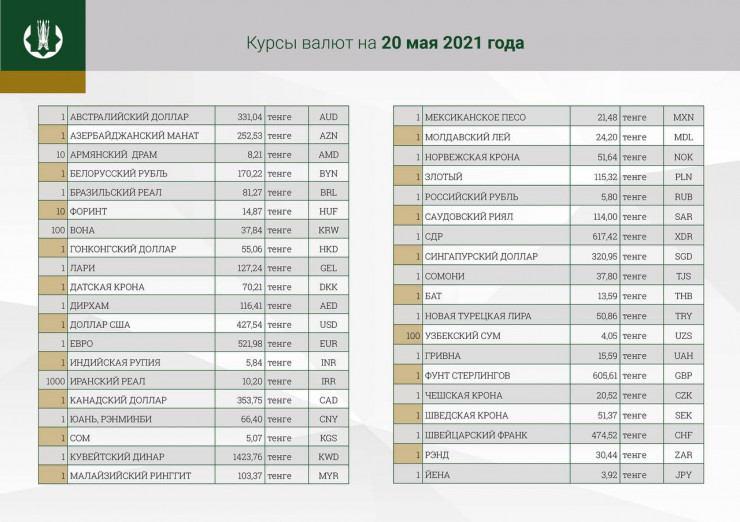 В четверг курс доллара к тенге будет составлять 427,54 тенге. Отметим, что официальный курс доллара на 19 мая составляет 426,05 тенге.