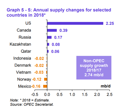 Также "сюрпризы" ожидаются от стран, не входящих в ОПЕК. Их вклад в рост составит 2,24 миллиона баррелей в сутки в 2019 году, до 64,43 миллиона. Общее предложение нефти в мире в феврале 2019 года составило 99,15 миллиона баррелей в сутки в годовом выражении и 1,5 миллиона - в месячном. Как отмечают авторы прогноза, рост предложения стран вне ОПЕК произошел главным образом из-за США, Великобритании и Бразилии.