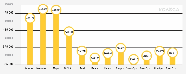 Если в начале года на сайте на продажу ежемесячно выставлялось почти полмиллиона автомобилей, то к концу года их количество сократилось до 350-360 тысяч. Пик активности продавцов пришелся на февраль.