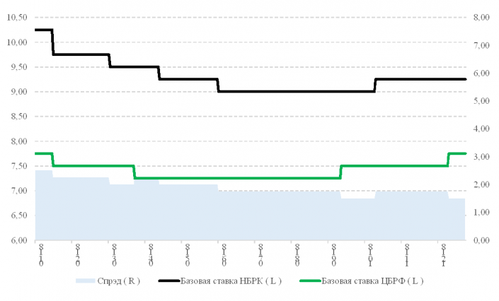 Процентные ставки Нацбанка Казахстана и Центробанка России в 2018 году, в процентах