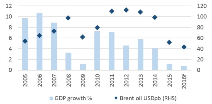"На нефтегазовую промышленность в I квартале 2016 года пришелся 21 процент ВВП и 53 процента от общего объема экспорта. Казахстанские производители уменьшили добычу нефти в I квартале 2016 года по причине снижения цен, естественной убыли на освоенных месторождениях (месторождение ПетроКазахстан), сокращения буровых работ, технического обслуживания на некоторых месторождениях (Карачаганак).
