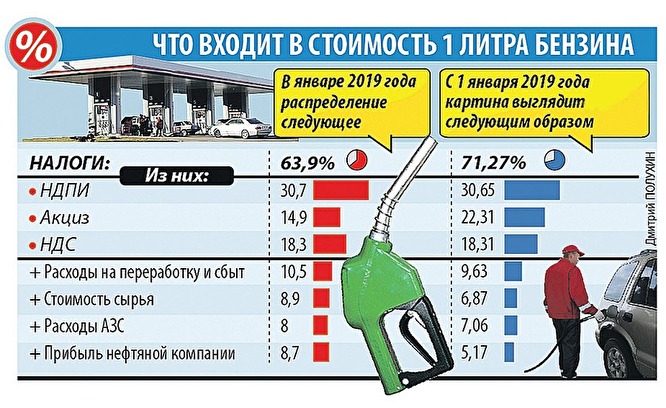 Там же он опубликовал инфографику о том, что входит в стоимость одного литра бензина в России.